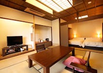 | 客室の設備・備品 | 全室バストイレ・全室シャワー・全室冷暖房・テレビ・冷蔵庫・インターネット接続(無線LAN有り)・ドライヤー・温水洗浄トイレ・ハンドタオル・バスタオル・ボディソープ(石けんの場合有り)・シャンプー(リンスインシャンプーの場合有り)・リンス・部屋着(浴衣・パジャマ・バスローブ等)・歯磨きセット・髭剃り・くし 等 |